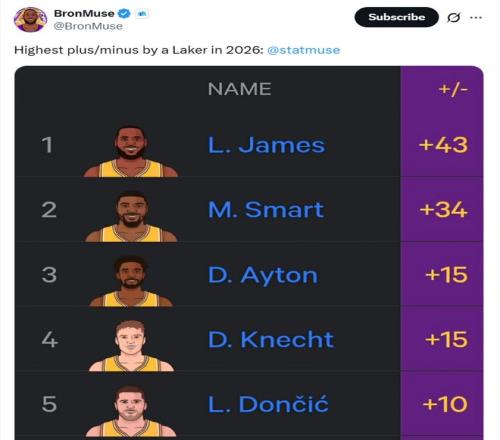 更重要的是,詹姆斯在拿下漂亮数据的同时并没有伤害球队,26年以来詹姆斯以+43的累计正负值高居全队第一,斯马特+34排在第二。